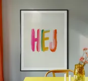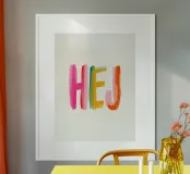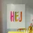 La parola "Hej" (in svedese "ciao") in pennellate colorate e allegre. Ricco di dettagli e colorato.