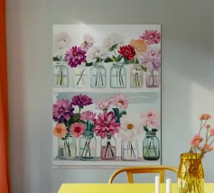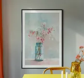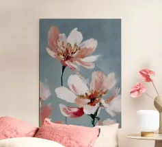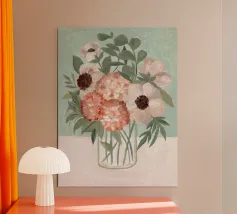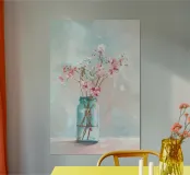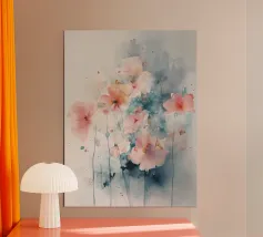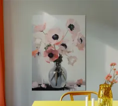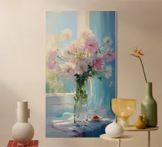 Questa delicata opera d'arte contemporanea raffigura fiori rosa tenui disposti in un semplice vaso di vetro, resi con pennellate ariose e dolci tonalità pastello. Il vaso traslucido e le forme floreali fluttuanti creano un senso di leggerezza, calma e tranquilla intimità. Le sottili texture e lo sfondo astratto rafforzano l'atmosfera poetica, invitando alla quiete e alla riflessione. Questo pezzo celebra la semplicità e la fragile bellezza, rendendolo ideale per interni sereni, camere da letto o spazi moderni ispirati alla morbidezza e alla grazia.