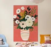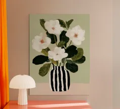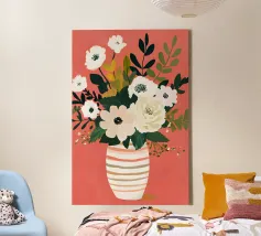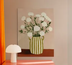 Una natura morta floreale minimalista in cui morbidi fiori bianchi e verdi stratificati si raccolgono delicatamente in un vaso di ceramica a righe. Le calde tonalità corallo e le pennellate espressive creano una sensazione di cura, equilibrio e tranquilla pienezza. Quest'opera d'arte parla di sostegno e fioritura: calma, stabile e completa. Una presenza serena ma edificante per interni moderni, scandinavi o in stile soft.