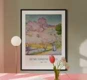 Celebrate la bellezza della primavera con questo vibrante capolavoro divisionista di Henri-Edmond Cross (1856-1910). Questo poster d'arte raffigura un paesaggio lussureggiante con alberi pieni di fiori bianchi e rosa, resi con la tecnica tipica dell'artista di applicare piccoli punti di colore puro. La scena, probabilmente "Spring Trees in Blossom", cattura la freschezza e il colore della stagione. Prodotto come arte digitale di alta qualità a 7000x5000 pixel e 300 dpi, garantisce una rappresentazione fedele dei colori brillanti e dei dettagli più fini per un'opera d'arte di prima qualità.