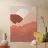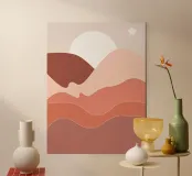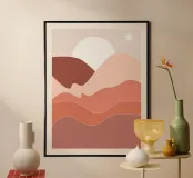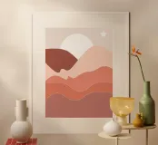 Curved layers in warm earthy tones form abstract hills under a large sun and a single white star. The colors blend smoothly, creating a serene and minimalist landscape.