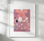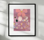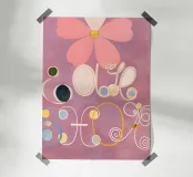 Questa suggestiva stampa d'arte presenta "The Ten Largest (No.5), Adulthood" di Hilma af Klint, un'accattivante opera astratta del 1907. La composizione è collocata su un morbido sfondo lilla e comprende un grande ed etereo fiore rosa in alto. In basso, forme astratte di lettere, cerchi e spirali bianche, blu e gialle che si intrecciano creano un senso di crescita organica e di simbolismo spirituale. Quest'opera mostra la visione astratta pionieristica di Klint, che esplora i temi delle fasi della vita. Questo poster digitale di alta qualità (7000x5000 pixel, 300 dpi) cattura magnificamente la bellezza mistica e l'avanguardia dell'opera di Klint.
