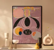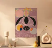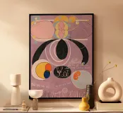 Questa affascinante stampa d'arte presenta "The Ten Largest, No. 6, Adulthood" di Hilma af Klint, un'opera astratta ricca di forme simboliche. La composizione, su un morbido sfondo lilla, comprende archi neri, cerchi concentrici e linee vorticose in rosa, giallo, blu e arancione. Sono presenti anche forme organiche e intriganti elementi di scrittura, che riflettono l'esplorazione di Klint di concetti spirituali e scientifici. Questo poster digitale di alta qualità (7000x5000 pixel, 300 dpi) cattura magnificamente la bellezza eterea e la maestria innovativa dell'opera pionieristica di Klint.