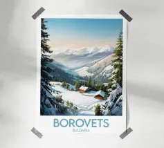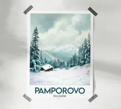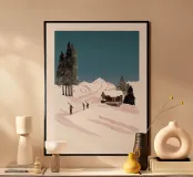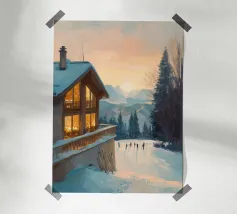 Paesaggio invernale minimalista con capanna, alberi e sciatori.