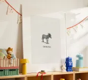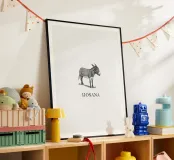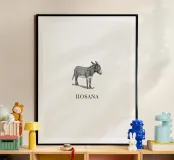 Un'illustrazione dettagliata di un asino è centrata su uno sfondo semplice, con la scritta "HOSANA" in basso. La semplicità del disegno mette in risalto l'intricatezza dei dettagli dell'asino.