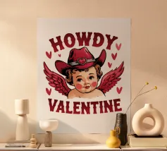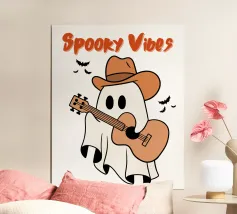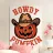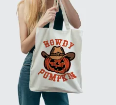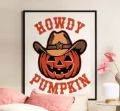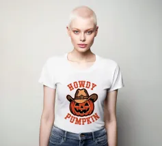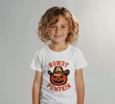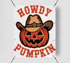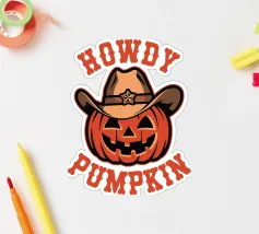 Un'allegra zucca indossa un cappello da cowboy, accompagnato dal testo scherzoso "Howdy Pumpkin". Il disegno combina i temi di Halloween e del western con un tocco giocoso.