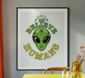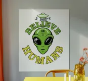 La testa di un alieno verde è circondata dalle parole "I Don't Believe in Humans" (Non credo negli esseri umani) in grassetto e con un testo scherzoso. Sopra il testo, un piccolo UFO e le stelle completano il tema extraterrestre.