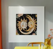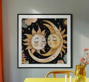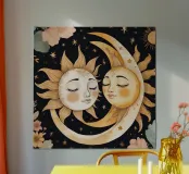 I volti celesti del sole e della luna si intrecciano in una notte floreale poster con telaio in legno