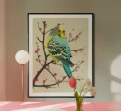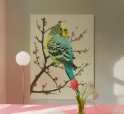 Il pappagallino appollaiato su un ramo in mezzo ai fiori poster