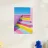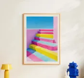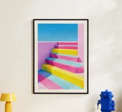Pittura acrilica di scale a strisce rosa e gialle contro un cielo blu brillante. Composizione minimalista e geometrica con linee pulite, luce soffusa e una tavolozza di colori estivi di ispirazione rétro. Design moderno, accattivante ed equilibrato.