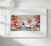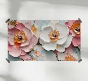 Questo poster di grande impatto presenta una rappresentazione ravvicinata e altamente strutturata di grandi fiori sbocciati, resi con una spessa tecnica di impasto che conferisce loro un sorprendente effetto tridimensionale. I petali rosa tenue e bianchi con i centri arancioni caldi si stagliano su uno sfondo sottile e vorticoso di blu tenui e crema, creando una composizione floreale lussuosa e tattile. Realizzato con un'eccezionale qualità artistica digitale a 7000x5000 pixel e 300 dpi, questo poster assicura che ogni pennellata espressiva e ogni ricco dettaglio sia splendidamente conservato.