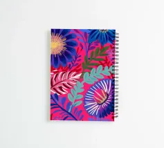 Un suggestivo disegno di foglie tropicali stilizzate in varie tonalità di indaco profondo, blu e viola, con accenni di rosa, che creano una cascata botanica ricca, dinamica ed elegante.