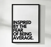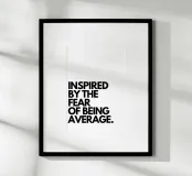 "La frase "INSPIRED BY THE FEAR OF BEING AVERAGE!", impilata su più righe e resa con un carattere sans-serif nero in grassetto su uno sfondo bianco pieno, trasmette un messaggio di ambizione e di spinta a eccellere",