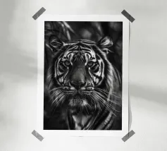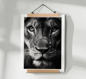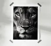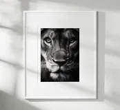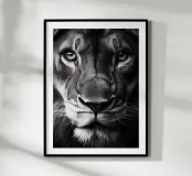 Questo ritratto ravvicinato cattura l'intensità e la potenza di una leonessa, evidenziando ogni dettaglio del suo sguardo penetrante e del suo manto. Un'opera accattivante, perfetta per una decorazione audace ed elegante, che porta un tocco di maestosità alla vostra casa.