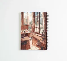 finestra luce solare tende paesaggio urbano grattacieli nuvole tazze da tè sedie pavimento in legno libri tavolo pianta da interno pianta in vaso scaffali stanza illuminata dal sole interno accogliente vista urbana tazze da caffè arredamento d'interni luce del mattino