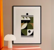 Questo pezzo, intitolato "Interplay", è uno studio sulla composizione geometrica e sull'armonia dei colori. Definita da un rettangolo verticale, l'opera presenta una disposizione complessa ma equilibrata di forme circolari e rettilinee su un fondo caldo e neutro. La composizione esplora il rapporto dinamico tra spazio positivo e negativo, utilizzando una tavolozza ristretta di nero, verde oliva, marrone caldo e crema per creare un senso di stabilità e movimento. Il preciso accatastamento e la segmentazione delle forme evidenziano un avvincente gioco di simmetria e asimmetria.