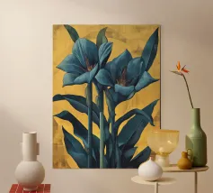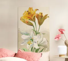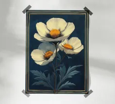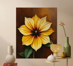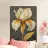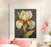 L'immagine mostra una rappresentazione realistica e decorativa di un fiore di iris. I petali sono in morbide tonalità di bianco e giallo, con linee sottili e ombreggiature che ne sottolineano la naturale consistenza e profondità. Lo sfondo scuro e strutturato con accenti dorati conferisce all'immagine un'atmosfera sofisticata e lussuosa. L'effetto complessivo è dettagliato, elegante e artistico. Un vero e proprio colpo d'occhio!