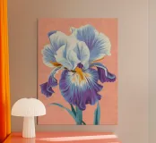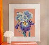 Una rappresentazione dettagliata e vibrante di un singolo fiore di iris in piena fioritura, che mostra i suoi intricati petali nei toni del blu, del viola, del bianco e del giallo. L'attenzione si concentra sulla maestosa bellezza del fiore.