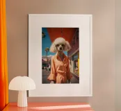 Isabelle, la barboncina dal pelo bianco, passeggia elegantemente per le strade di Palm Springs, indossando un superbo completo arancione. Con i suoi occhiali da sole dorati e il suo atteggiamento sicuro, incarna lo spirito della controcultura della Beat Generation che ha segnato la città, combinando uno stile di vita eccentrico con il senso della moda.