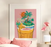 Un'isola tropicale con palme e onde dell'oceano si trova all'interno di un bicchiere di tè freddo sotto un sole splendente.