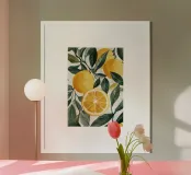 Fresca, vibrante e piena di energia naturale, questa opera d'arte mostra limoni maturi con foglie verde intenso in una rappresentazione stilizzata e illustrativa. I colori sono succosi e chiari e il disegno ricorda i motivi botanici con un tocco moderno. Il motivo è ideale per cucine, sale da pranzo o spazi creativi dal design mediterraneo o naturale. Un quadro perfetto per gli amanti della leggerezza estiva e dell'estetica naturale.