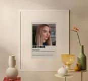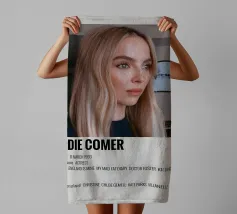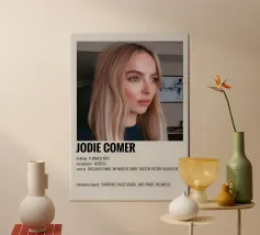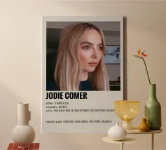 Stampa artistica con cornice in legno di alta qualità raffigurante Jodie Comer. Design minimalista e moderno ideale come decorazione per soggiorno o ufficio. Perfetta come regalo per appassionati di cinema e serie TV britanniche. Produzione europea con materiali sostenibili e rifiniture curate.