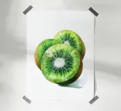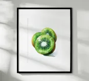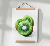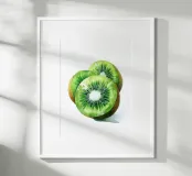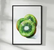 Illustrazione realistica di kiwi tagliati a fette, che rivelano la loro polpa verde vibrante e i delicati semi neri. Un poster perfetto per una decorazione fresca e vitaminica della cucina.