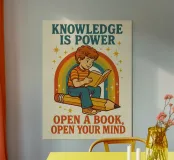 Un bambino è seduto e legge un libro sopra una grande matita, circondato da un arcobaleno colorato e da stelle. Le frasi "La conoscenza è potere" e "Apri un libro, apri la tua mente" sottolineano l'importanza della lettura e dell'istruzione.