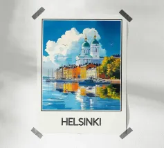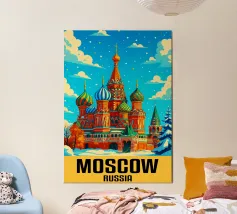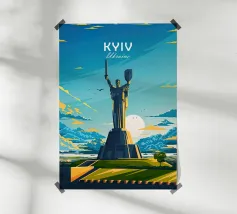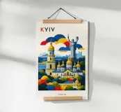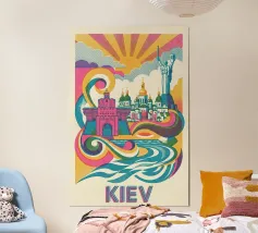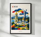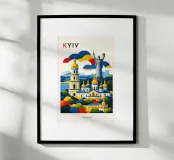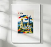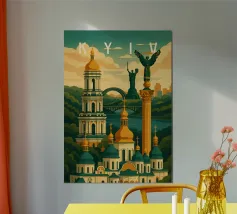 A bold, graphic celebration of Kyiv, rendered through clean geometry and confident colour blocking. Iconic landmarks rise in layered harmony, combining historic architecture and national symbolism into a balanced, uplifting composition. The structured forms and vibrant contrasts convey strength, heritage, and resilience without relying on fine detail.