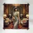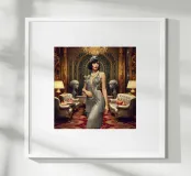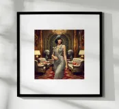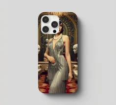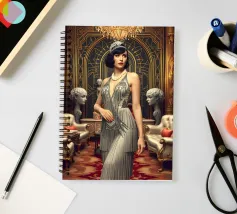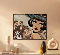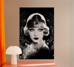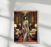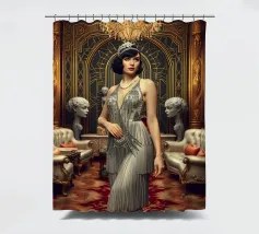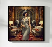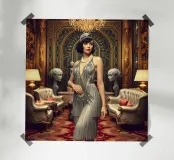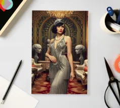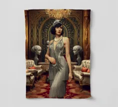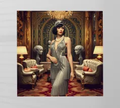 Elegante flapper con un lussuoso abito di perline, perle e abiti Art Deco... Questa immagine mostra un'affascinante flapper girl circondata da opulenti accenti metallici, arredi sontuosi e decorazioni ornamentali, mescolando elementi futuristici e Art Déco con curve organiche e surrealismo sognante.