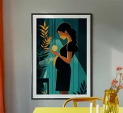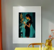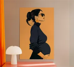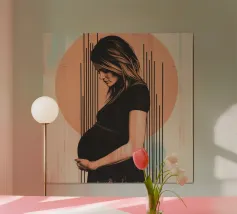 A powerful and serene illustration capturing the miracle of new life. In a quiet room, an expectant mother holds a glowing orb, symbolizing the radiant energy and hope growing within. The dramatic contrast between warm light and cool, dark tones makes this a modern and deeply moving piece of art.