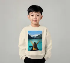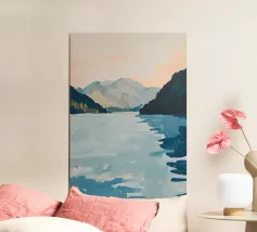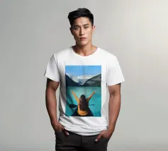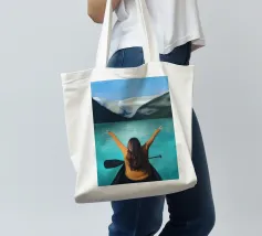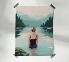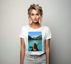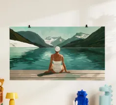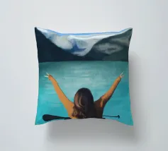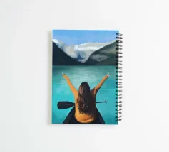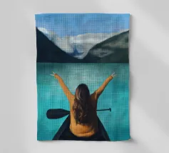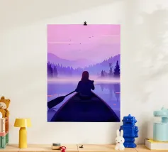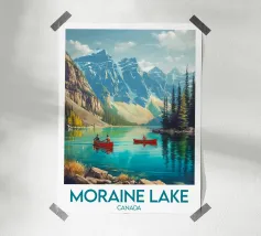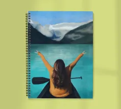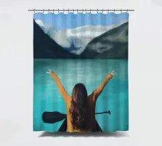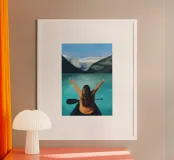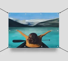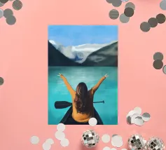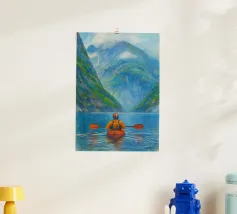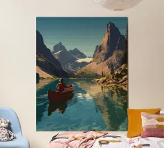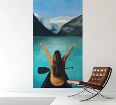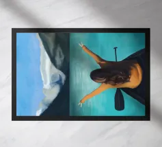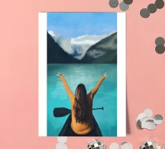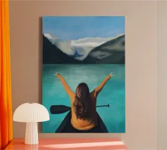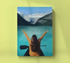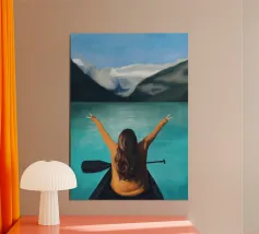Un'edificante pittura digitale di una donna in canoa, con le braccia alzate in segno di pace, circondata da acque turchesi e da maestose montagne innevate. Questo paesaggio sereno cattura la libertà, l'immobilità e la connessione con la natura. Perfetto per gli amanti dell'avventura, dell'arredamento di viaggio e degli spazi tranquilli. Ideale per camere da letto, soggiorni e cabine. Un bellissimo regalo per gli esploratori, i sognatori e gli amanti delle fughe consapevoli e panoramiche.