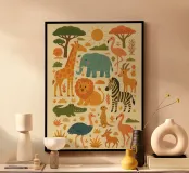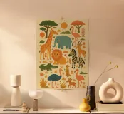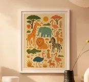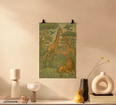 Immergetevi nel morbido e solare mondo della savana con questa affascinante illustrazione, ideale per grandi e piccini. Giraffa, leone, elefante, zebra, fenicotteri rosa e altri animali iconici della savana convivono in una scena felice e rilassante. Lo stile grafico è allo stesso tempo minimalista e poetico e aggiunge un tocco giocoso. Perfetta per decorare la cameretta di un bambino, la stanza dei giochi o la stanza della famiglia, questa illustrazione è un invito alla fuga, alla scoperta della natura e dell'immaginazione.