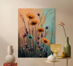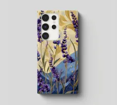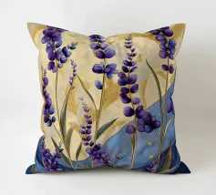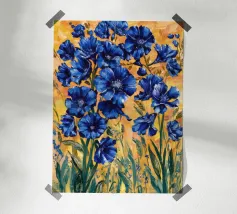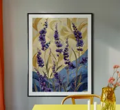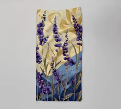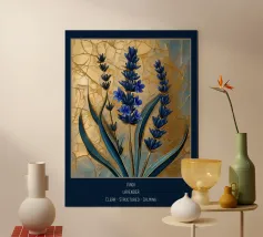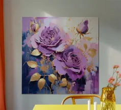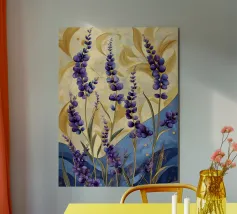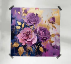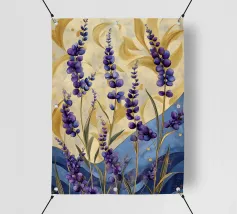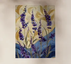 Das Bild zeigt leuchtend lila Blüten in einem dekorativen, stilisierten Kunststil. Die Blumen sind kunstvoll arrangiert und werden von geschwungenen goldenen und blauen Mustern umgeben, die eine elegante und dynamische Atmosphäre schaffen. Der Stil wirkt verspielt und gleichzeitig edel, mit kräftigen Farben und harmonischen Formen. Ein faszinierendes Zusammenspiel aus Natur und Ornamentik!