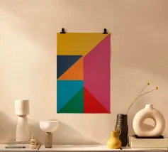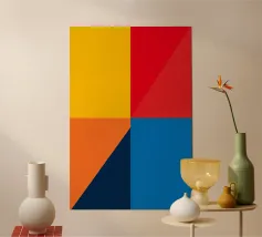 Vibranti forme geometriche in viola, rosso, giallo e blu si sovrappongono su un audace sfondo giallo e scuro, mostrando un'arte astratta dal tocco moderno.