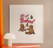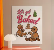 Due personaggi di pan di zenzero sono umoristicamente raffigurati con la frase "Let's get Baked" sopra di loro. Fiocchi di neve e un albero di Natale decorato aggiungono un tocco di festa al disegno.