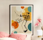 A vibrant and dynamic jazz-themed poster inspired by the energy of New Orleans. The expressive line drawing of a trumpeter, surrounded by bold geometric shapes and warm retro tones, captures the rhythm and soul of jazz. Flowing musical notes and playful typography add to the lively atmosphere, making this piece a celebration of sound, movement, and artistic spontaneity.