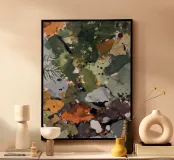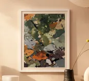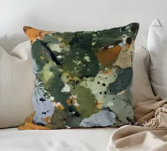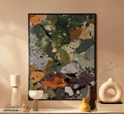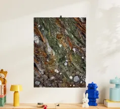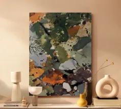 Questo pezzo evoca il pavimento riccamente disseminato di una foresta del nord: pietre macchiate di lichene, aghi caduti e foglie arancione-ruggine. Con i suoi verdi oliva profondi, i grigi ardesia, gli ocra e i toni freddi dell'argilla, la composizione imita il modo in cui la natura trasforma la decadenza in bellezza. Astratto, terroso e tattile.