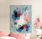 Un dipinto astratto espressivo in cui i toni freddi del blu e quelli delicati del rosa si scontrano in una texture stratificata. Quest'opera d'arte aggiunge profondità, emozione e carattere moderno agli spazi contemporanei.