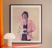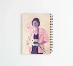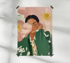 Illustrazione di una donna che tiene in mano 2 gigli. Indossa una giacca rosa a righe.
