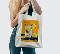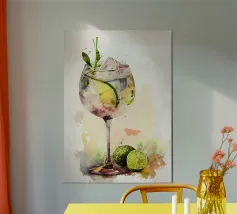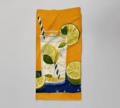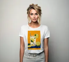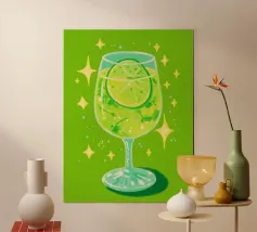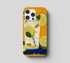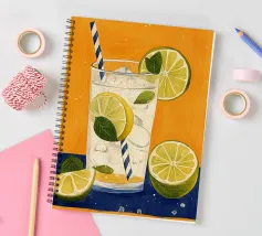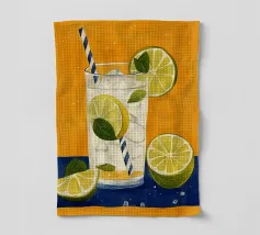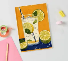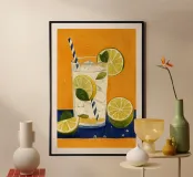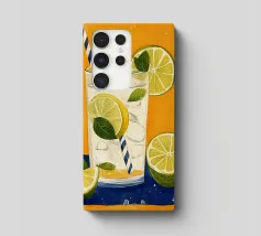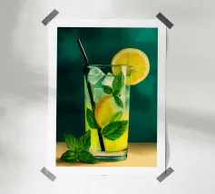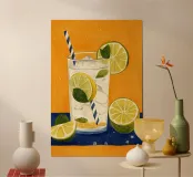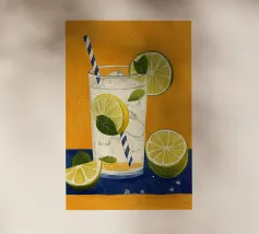 L'immagine mostra una bevanda rinfrescante in un bicchiere con cubetti di ghiaccio, fette di limone e foglie di menta. Dal bicchiere fuoriesce una cannuccia a righe bianche e blu. Lo sfondo arancione caldo contrasta fortemente con la superficie blu scuro su cui poggia il bicchiere. Lo stile dell'immagine è illustrativo e sembra dipinto a mano, con colori forti e linee chiare e definite. La combinazione di contrasti cromatici e la rappresentazione semplificata conferiscono all'immagine un'estetica moderna e fresca che trasmette perfettamente uno stato d'animo estivo.