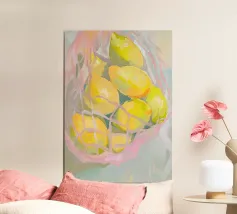 Un vibrante dipinto a olio che cattura un gruppo di limoni freschi in tonalità ricche e illuminate dal sole. La pennellata e i dettagli realistici evocano freschezza e calore, rendendolo una perfetta celebrazione visiva della bellezza degli agrumi e dell'eleganza naturale. Ideale per la cucina o per qualsiasi altro spazio abitativo o lavorativo.