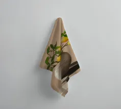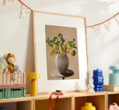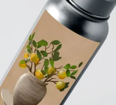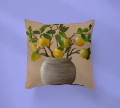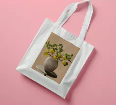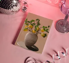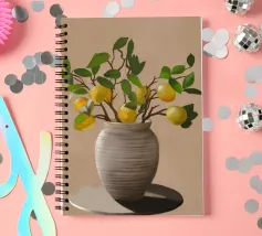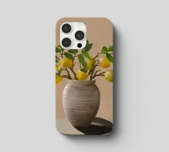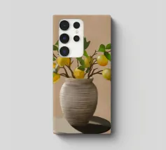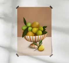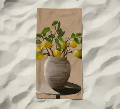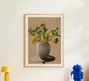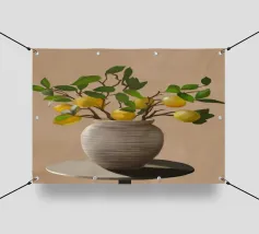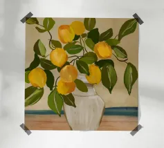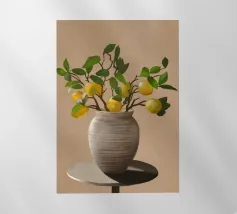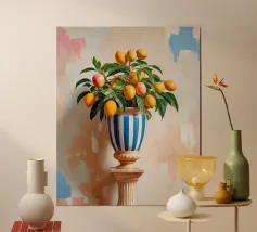 Una natura morta fresca e vivace con un vaso di ceramica pieno di rami di limone. Con i suoi toni caldi e lo sfondo minimalista, quest'opera d'arte porta il fascino mediterraneo e la bellezza naturale in qualsiasi cucina o spazio abitativo.