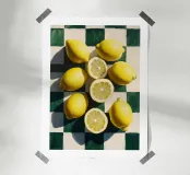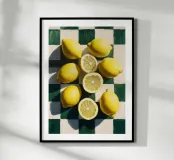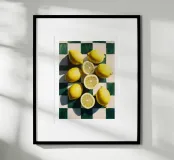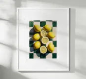 Composizione artistica di limoni interi e tagliati su un motivo a scacchiera verde e bianco. Un'illustrazione luminosa e retrò, perfetta per una decorazione murale elegante e mediterranea.