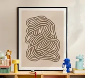 Un complesso motivo di linee marroni intrecciate si staglia su uno sfondo beige. Le linee si intrecciano e si attorcigliano in modo intricato, creando un disegno astratto simile a un nodo.