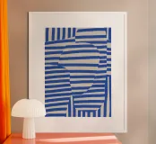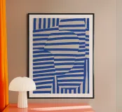 Audaci strisce blu e bianche creano forme geometriche in una composizione astratta. Il motivo forma un gioco dinamico di linee e curve, generando un intrigante ritmo visivo.