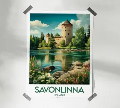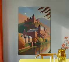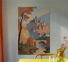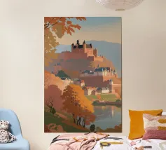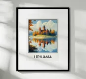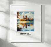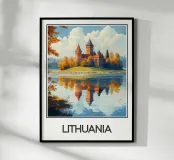 Admirez la beauté enchanteresse de la Lituanie avec cette superbe affiche. Un château médiéval entouré de forêts aux couleurs automnales, reflété dans un lac paisible, parfait pour une décoration murale élégante et apaisante.