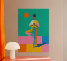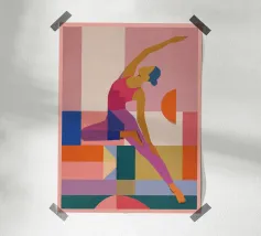Farbenfrohes Poster einer Frau in der Yoga-Baum-Pose im Stil von Matisse. Handgezeichnete Risograph-Optik mit Pastellfarben, flachen Formen und vintage Gouache-Textur.