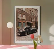 In una strada del quartiere londinese di Shoreditch, un'auto d'epoca retrò è parcheggiata davanti a una facciata di mattoni rossi con l'estetica color seppia di una macchina fotografica del passato.
