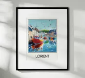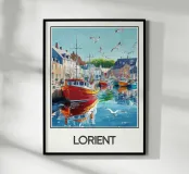 Un'illustrazione colorata del porto di Lorient, con barche da pesca tradizionali, case bretoni e gabbiani che animano il cielo. Un omaggio alla bellezza marittima della Bretagna.